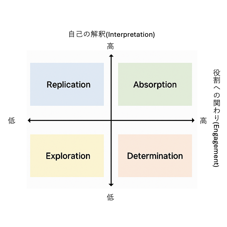 | Replication (レプリケーション) | 関わり(高) x 解釈(低) | 積極的に役割を遂行するが、既存の自分や過去のやり方を新しい役割に持ち込み、適合させる。 | 効率的な適合と現状維持 |