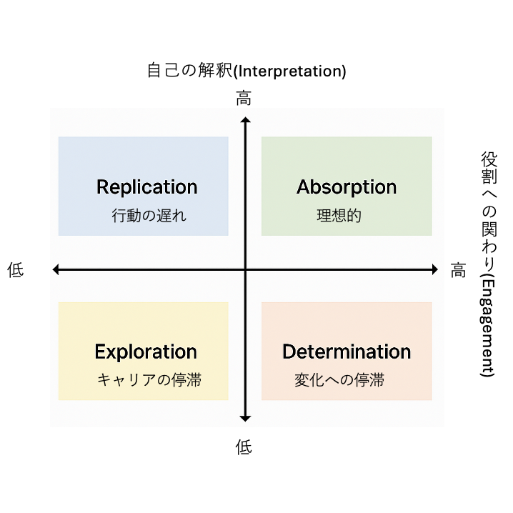| Absorption | 高 Engagement x 高 Interpretation | 最も創造的なキャリア成長をもたらします。役割に没頭しつつ、自己も役割に合わせて革新するため、新しいアイデンティティとスキルが確立されます。ただし、過剰な没入は燃え尽きのリスクがあります。 |