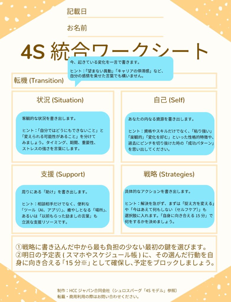 自分自身の現在地を整理するセルフケアとして、あるいは大切な誰かの転機を支える対話のツールとして「使える」ことを目指した「HCCジャパン合同会社」がお送りする独自のワークシートです。